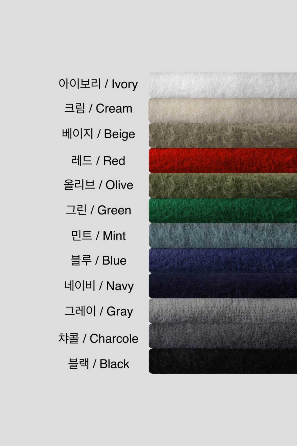 아이보리, 크림, 베이지, 레드, 올리브, 그린, 민트, 블루, 네이비, 그레이, 차콜, 블랙