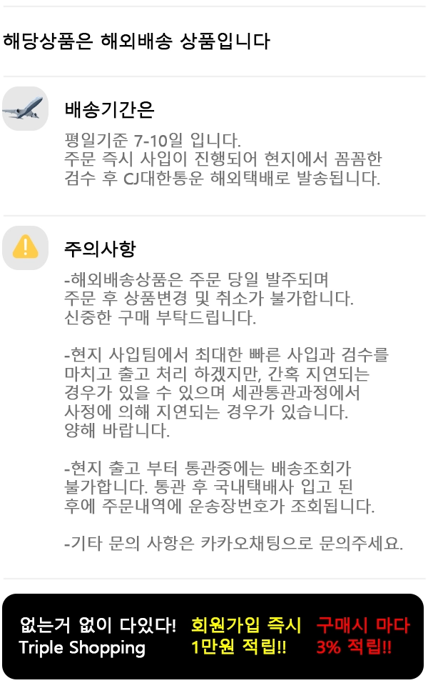 주문후 해외 발주가 바로 들어가기 때문에 주문후에는 배송지연및 어떠한 이유라도 취소 및 주소 변경 안되세요.